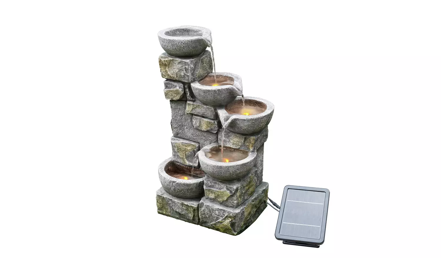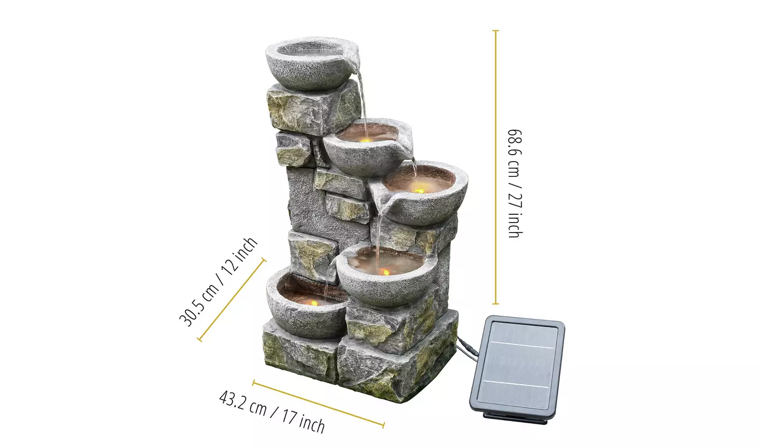 The Peaktop solar powered 4 tier flowing bowl fountain is perfect for your patio or garden. The natural looking stone effect makes it fit into any kind of style in your natural surroundings. Relax to the calm whisper of water flowing with this versatile solar powered decor. Includes a solar panel, LED lights and cable length is 2 Metres.