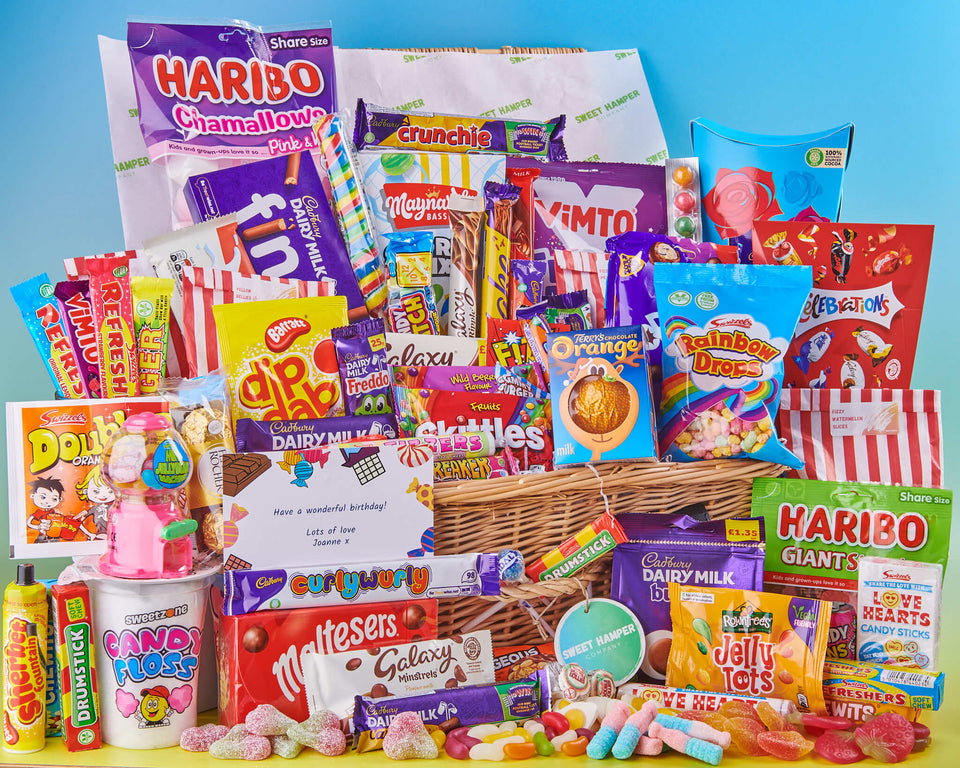 Every sweet and chocolate hamper is packed in the UK with care and contains a mix of classic sweets, retro sweets and chocoholic favourites. Please note that some of the hampers contents may change depending on stock.