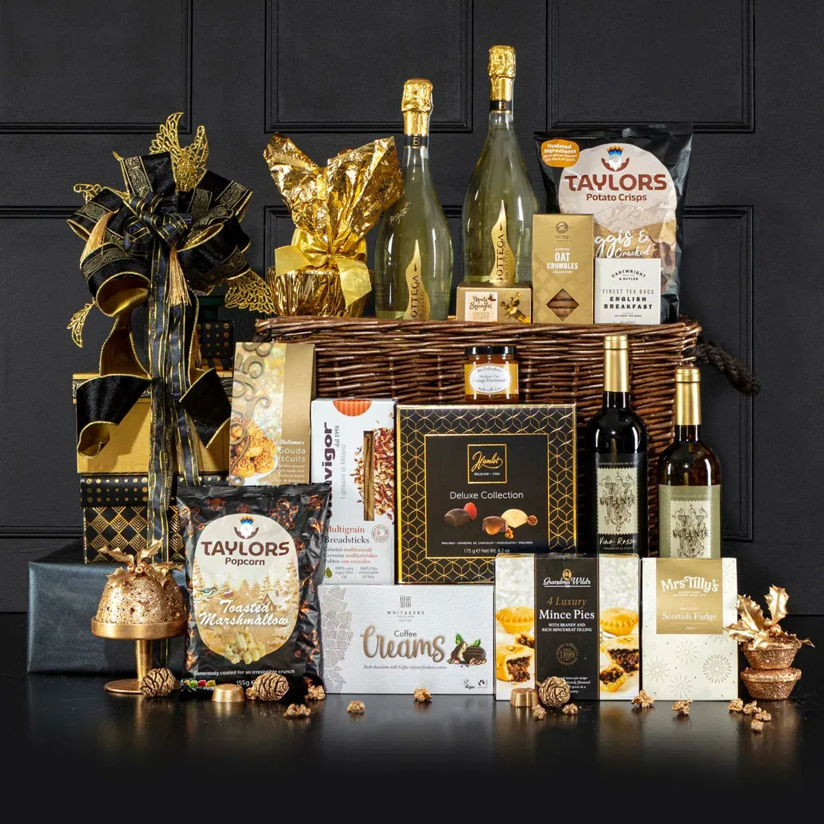 This Classic Christmas Hamper is a delightful and thoughtful gift that embodies the spirit of the festive season all in one basket. At its centre is not one, but two bottles of La Gioiosa Italian Prosecco, ready to create the perfect celebratory mood. Accompanying the Prosecco are a carefully selected red and white wine from the Volunte vineyards, chosen to complement the festive fare. No Christmas hamper would be complete without traditional festive classics. Inside, you’ll find a rich, fruited Christmas pudding from Chapel Bakery and Luxury mince pies from Grandma Wild’s. Delve deeper to discover an array of nibbles and cheese board favourites sure to delight any savoury lover! Light the fire, sit back, and indulge yourself and your loved ones with a selection of sweet treats. Enjoy a classic box of Hamlet’s Belgian chocolates and Mrs Tilly’s Original Scottish fudge, a firm favourite. Round off this Classic Christmas assortment with a box of traditional coffee creams from Whitaker’s. This Hamper is more than just a gift; it’s a celebration of the season’s finest flavours and delights. Packed by our team, all this and more will be delivered in a charming chunky wicker weave log basket with rope handle detail.