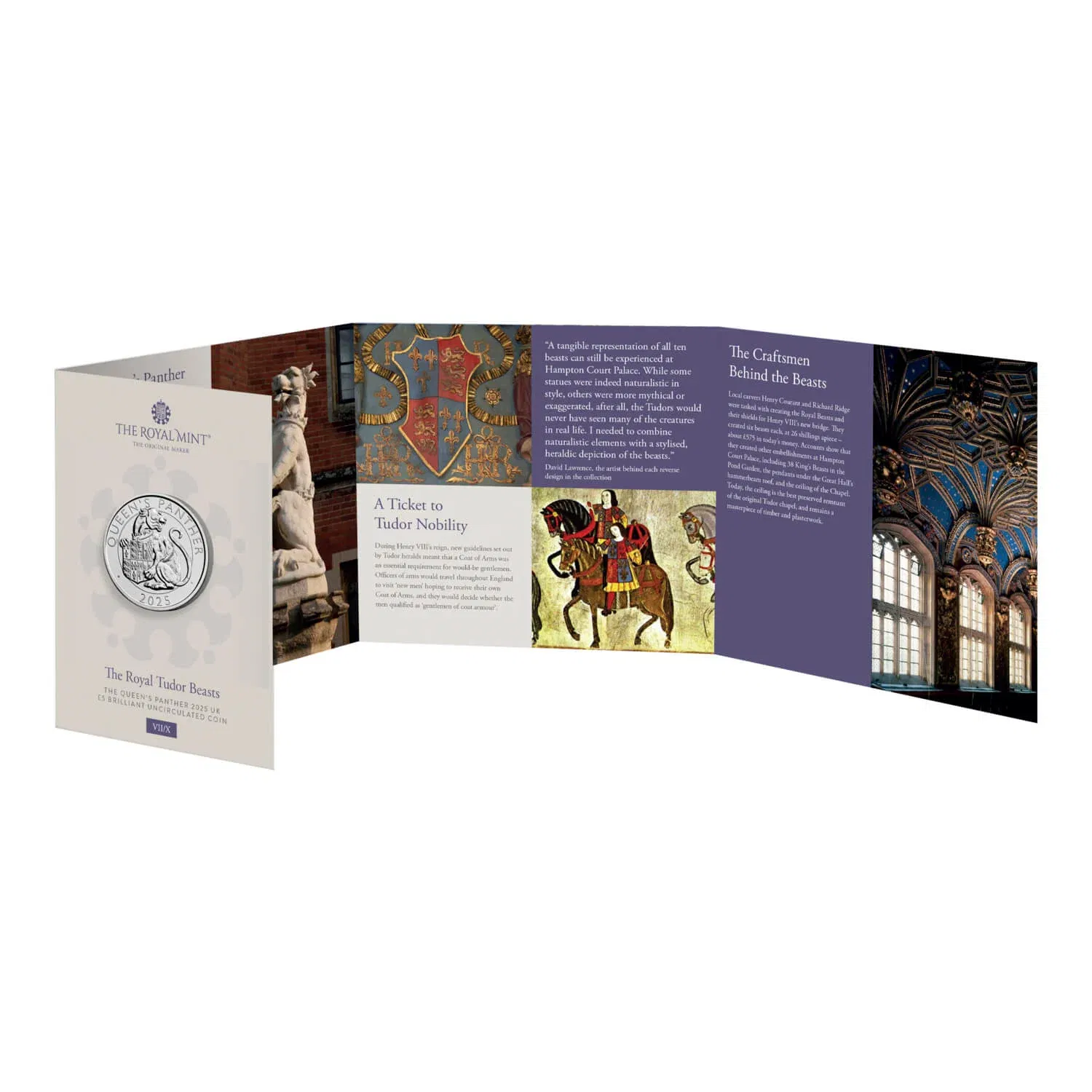 Created in collaboration with the experts at Historic Royal Palaces, the coin is housed within a fold-out wallet that explores the heraldry of Henry VIII and his third wife
