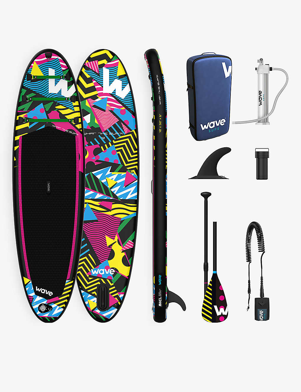 • Light weight, inflatable, non-slip deck pad, carry handle, five stainless steel tri-rings for easy mounting or customisation, the Wave quick-slide fin, safety leash attachment, all-over graphic print