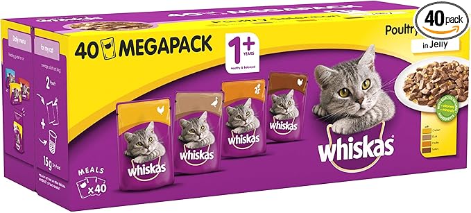 Whiskas Wet Cat Food Pouches, Delicious and Tasty Poultry Selection in Jelly, Suitable for Adult Cats Aged 1+, (40 x 100 g)-AUTO WIN 16/02