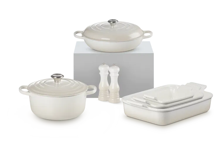 This Le Creuset cookware set brings together our most essential classic cookware pieces, so you’re always ready to entertain. Elevate your next gathering with our 24cm cast iron round casserole, 30cm shallow casserole, small, medium and large stoneware rectangular dishes, and a 21cm salt and pepper duo.
